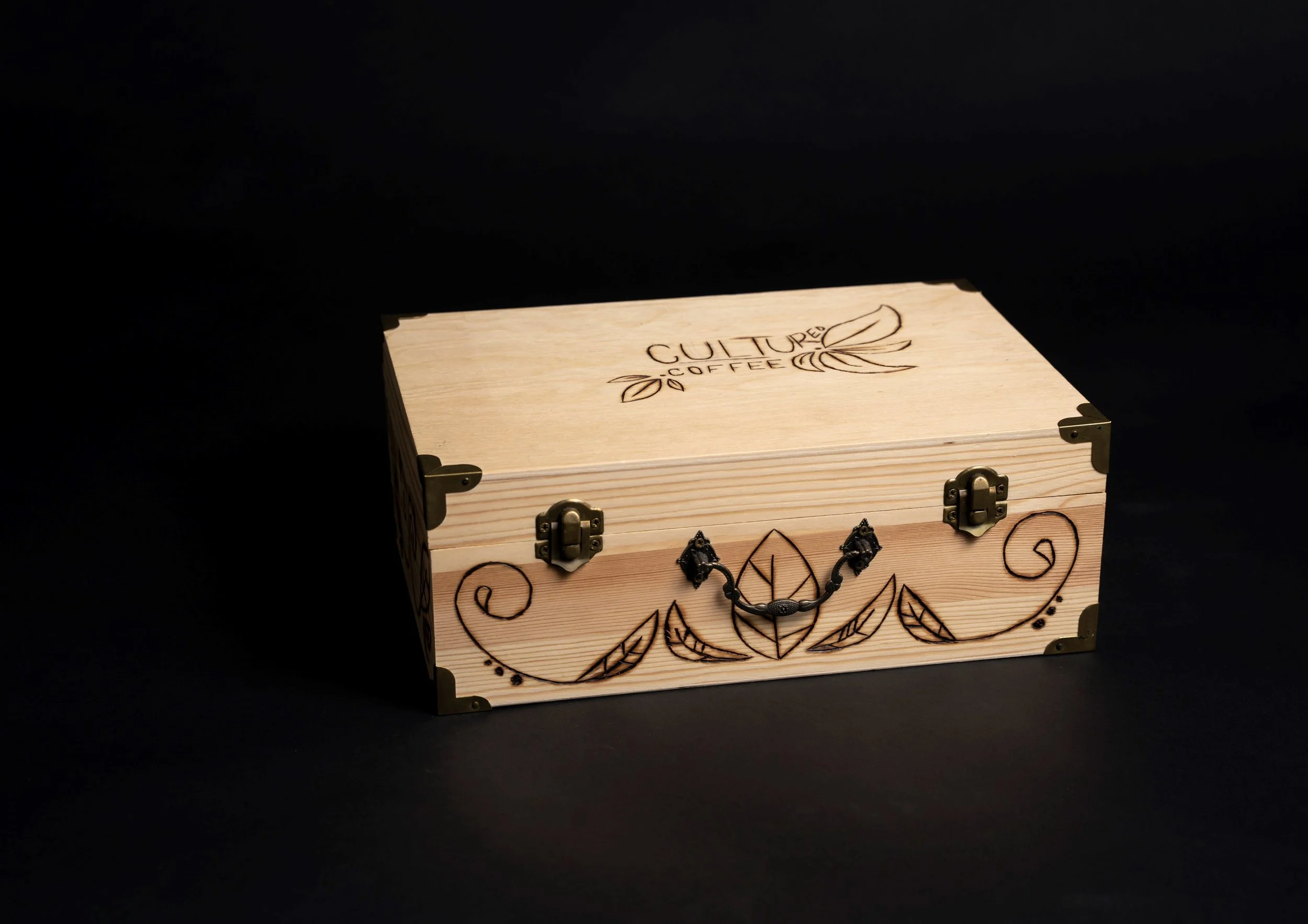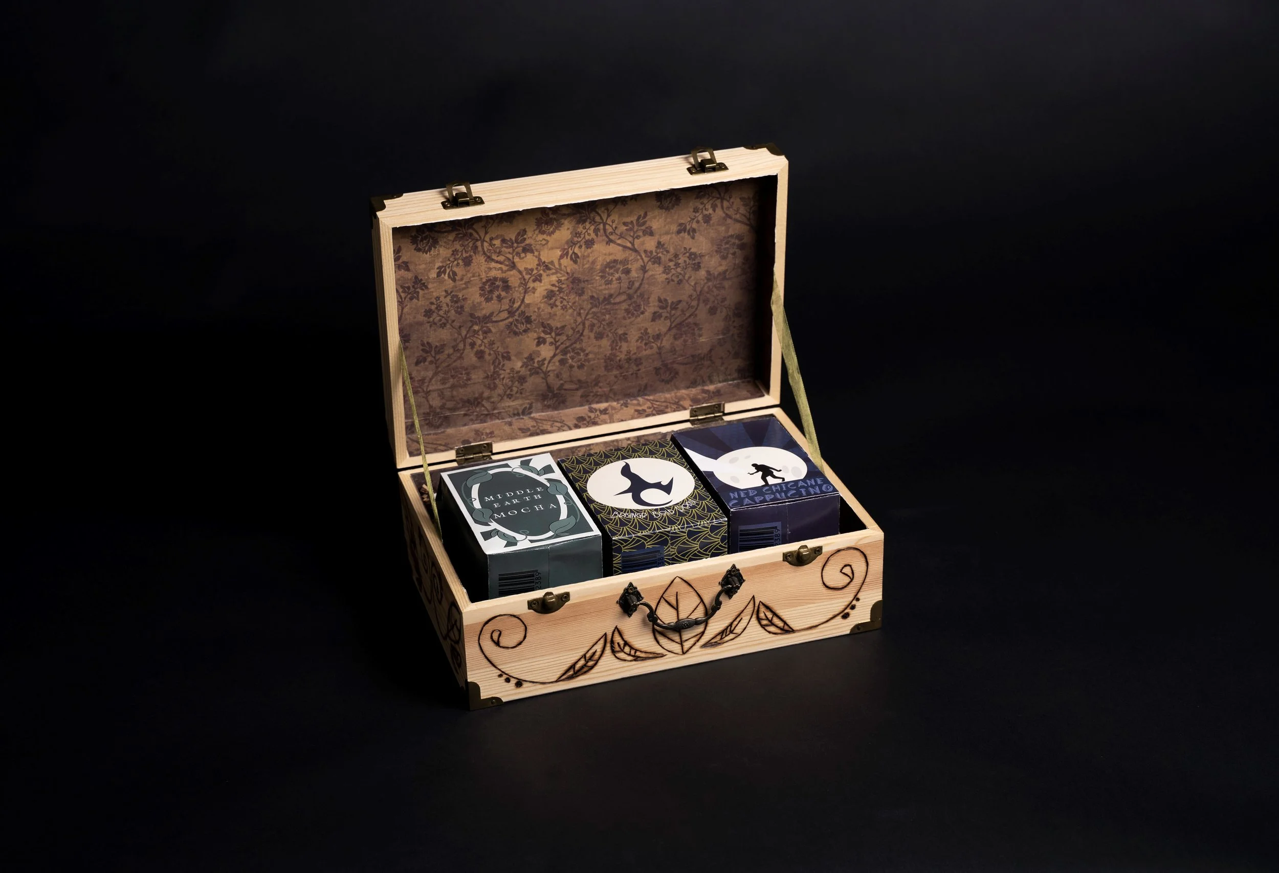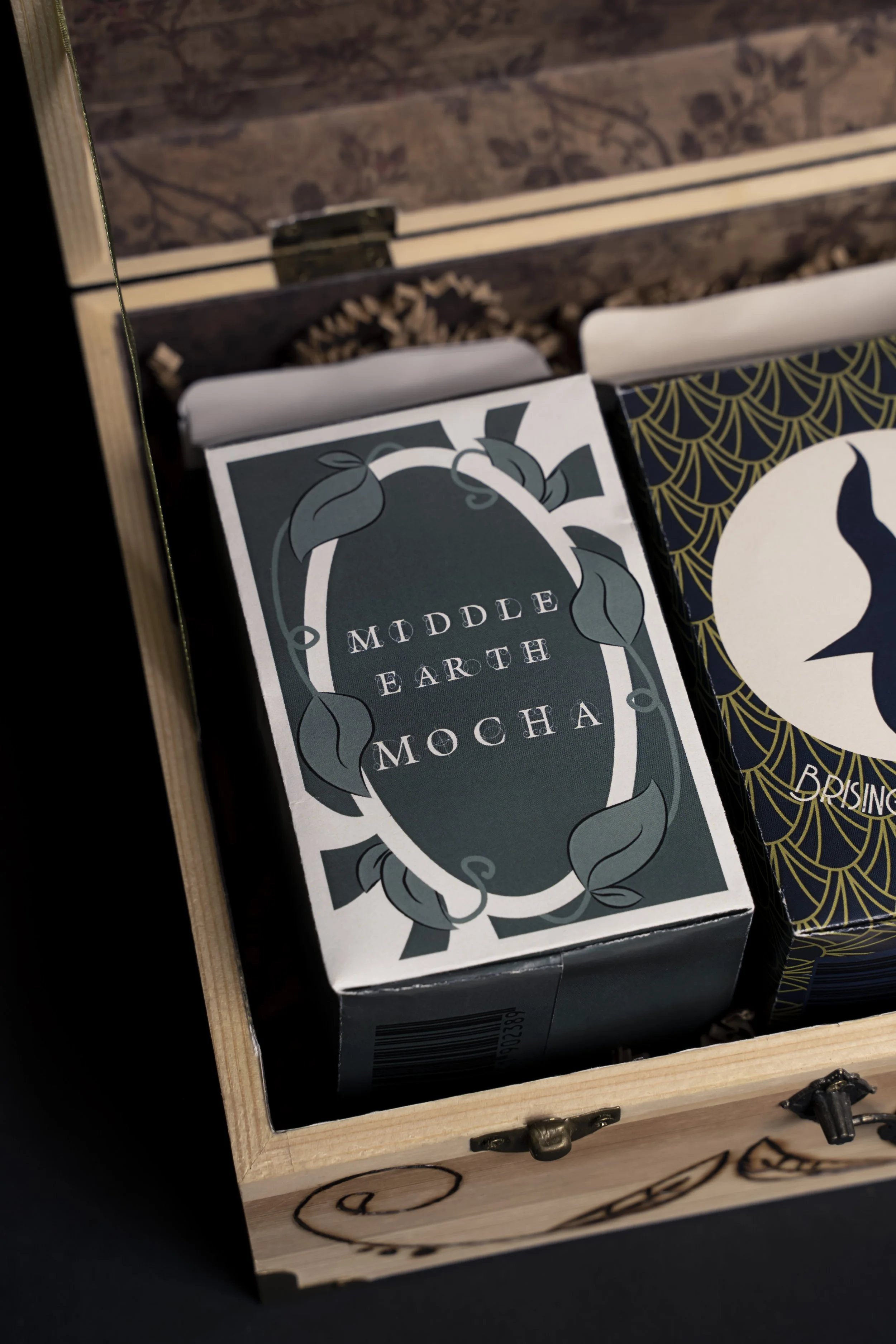 This project is a mock-up of a pop culture coffee subscription box that I designed. The theme is around pop culture, this box, in particular, being a fantasy-themed box. Each coffee is inspired by a different fantasy series as well as a different art style/period. The series and styles are Lord of the Rings and art nouveau, Eragon and art deco, and The Adventure Zone: Amnesty and pop art. The actual packing was designed digitally in Illustrator and the designs on the box were wood burned into it.